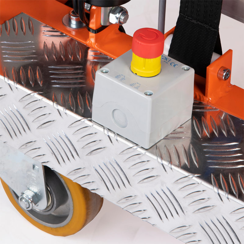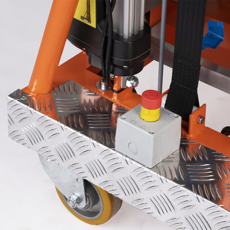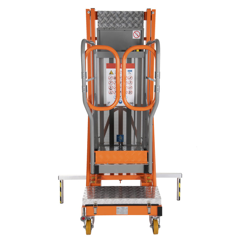 Dva boční stabilizátory zvyšují stabilitu zařízení na nakloněné ploše na 0,5 stupně. Extrémně lehká hliníková konstrukce, ergonomický tvar a malá velikost umožňují snadný transport zařízení a snadný pohyb na pracovišti. Pohonný systém se skládá ze dvou elektrických servomotorů s celkovým výkonem 3400 N a plynové pružiny s výkonem 1500 N. Výtah je poháněn gelovou baterií 12V 33 Ah.